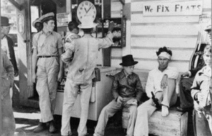 Migrant workers on their way to a field in Neches stop to enjoys cold drinks and candy under the watchful eye of the Bell Station attendant. View Larger |