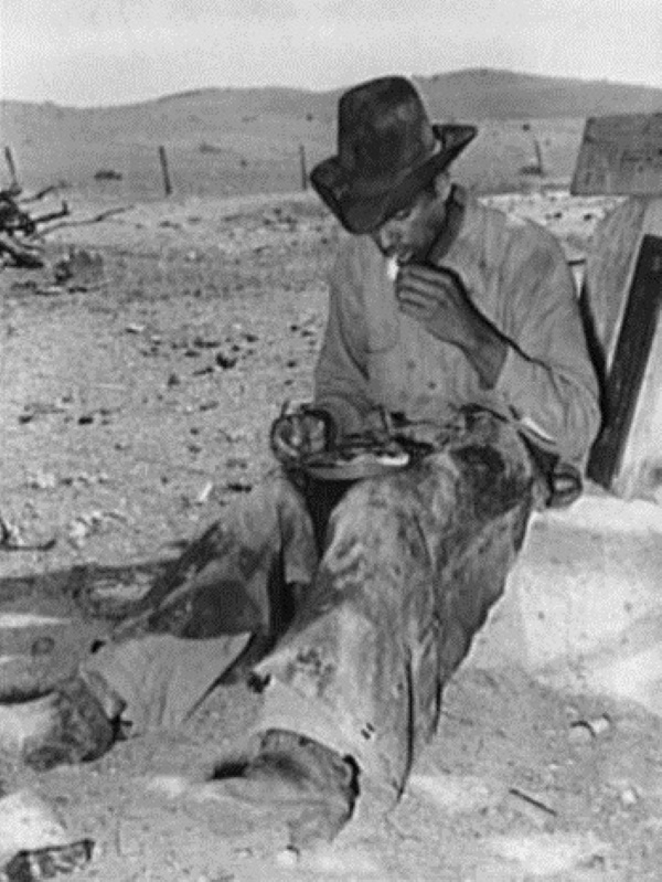 A weary cowboy eats from pewter plate after the roundup of 1939 in Presidio County Texas .. . . for more photos, stories and books about cowboys in Texas please see Texas Cowboy History |
