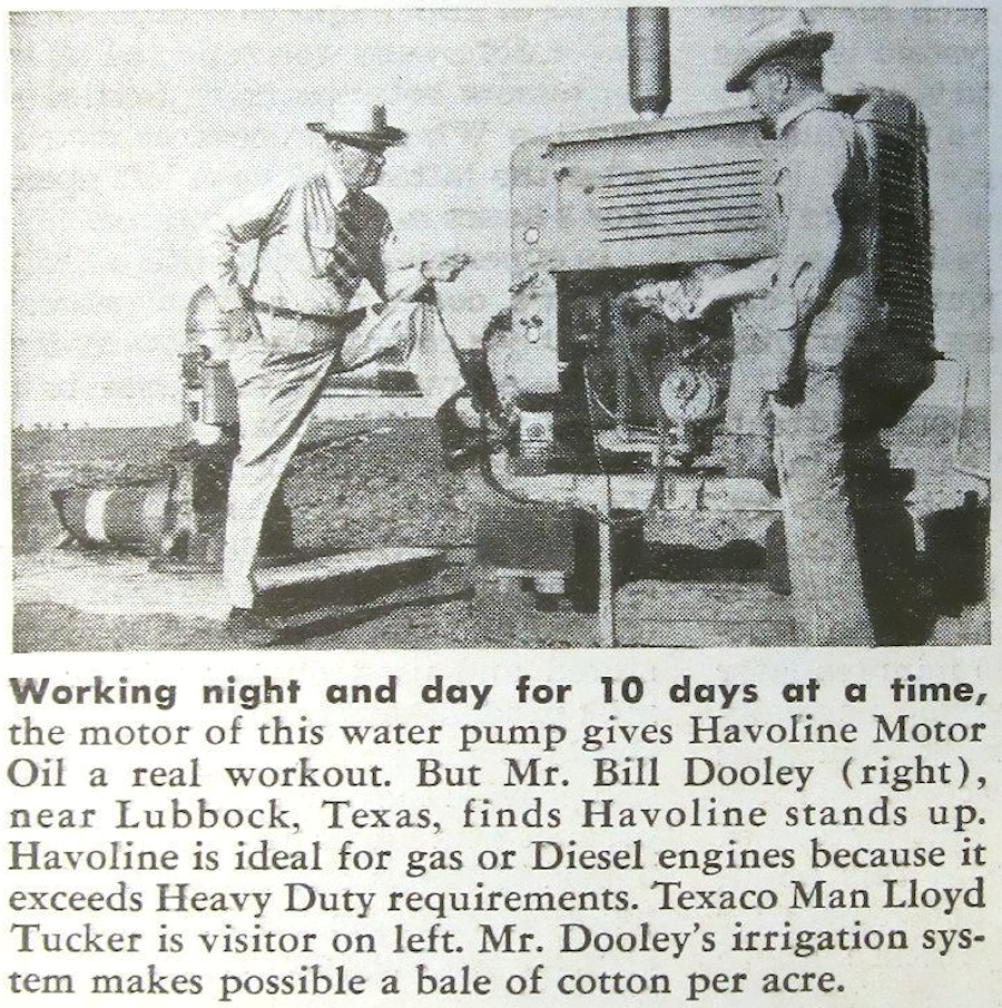 Dooley in Havoline Motor Oil Ad 1962In 1962 Bill Dooley of Lubbock Texas testimonial in a national ad for Havoline Motor Oil used in his irrigation motor |